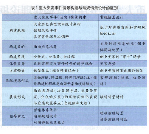 在傳統(tǒng)應急管理中,實戰(zhàn)演練之前往往開展情景設計,常規(guī)情景設計與重大突發(fā)事件情景構建無論在研究體量、研究目的,還是研究意義都存在著一定的差異,如表1所示。