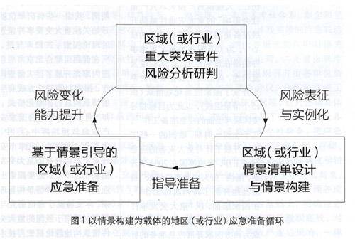 情景構建是一個地區(qū)(或行業(yè))的戰(zhàn)略風險管理工具,在地區(qū)(或行業(yè))的重大突發(fā)事件風險研判基礎上,可以確定地區(qū)(或行業(yè))情景清單并且對每項典型風險開展情景構建,對典型風險進行實例化表征;在情景構建結束后,一系列情景可以引導地區(qū)(或行業(yè))有的放矢開展應急準備行動,指導應急能力的提升;伴隨著風險環(huán)境的變化、應急能力的提高,在風險研判基礎上,可以將情景清單進行動態(tài)調整、或者對某項(不符合當下風險的)情景進行修訂。如此,可以形成一個以“情景構建”為載體的應急準備循環(huán),如圖1所示。