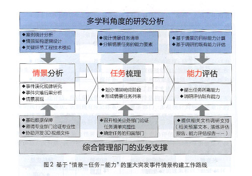 重大突發(fā)事件情景構建是理論與實踐的銜接,該項工作必須由科研部門和實踐綜合管理部門的密切配合,按照情景任務能力的邏輯主線依次展開,才能完成情景構建研究,具體工作路線如圖2所示。